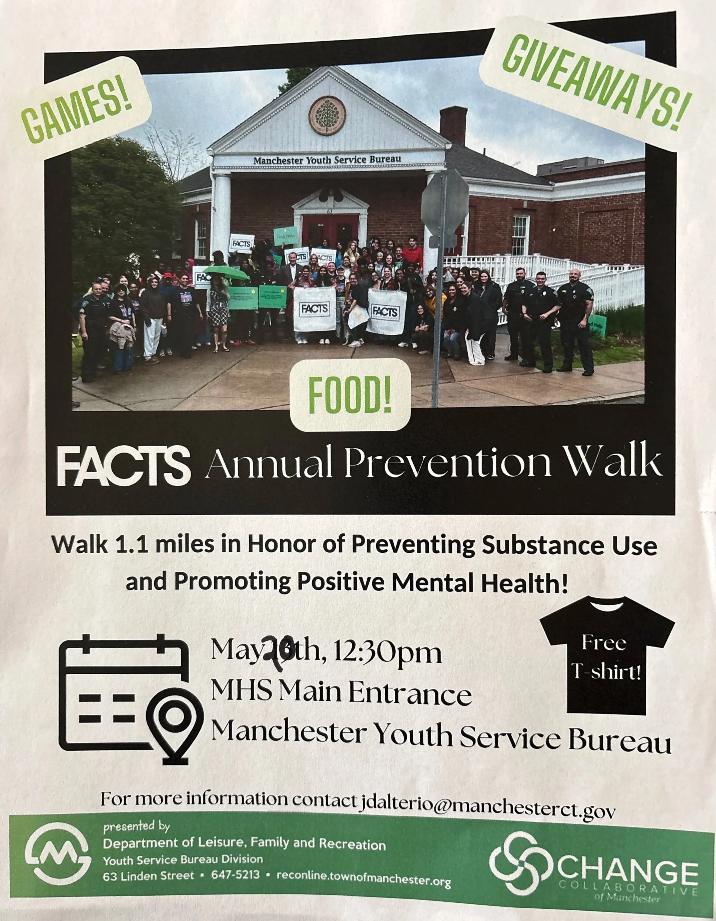 Drug Awareness Prevention Walk Wednesday, May 20, 2026 12:30 PM 1:30 PM MHS Main Entrance 134 Middle Turnpike East Manchester, CT, 06040 United States (map) Google Calendar ICS A 1.1 mile walk starting at Manchester High and ending at the Youth Service Bureau highlighting substance use prevention and promoting positive mental health.